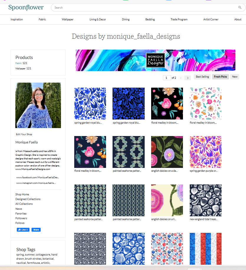 Spoonflower offers my art on fabric, wallpaper, and home decor products.